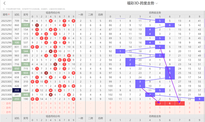 通过观察跨度及跨度属性走势可以发现:近10期内跨度出号主要以3到9之间的号码,本期跨度大概率仍会在此区间出号,即本期跨度看好3到9之间的号码。结合上述跨度走势图来看,本期跨度看好567等号码。