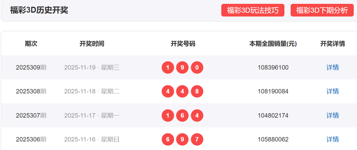 福彩3D上一期,开奖号码190,形态为组六,奇偶比为2:1,012路数值表现为100,和值10,和尾0,跨度9。
