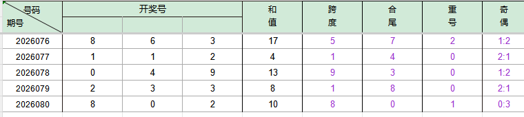 2026076期开奖号码863,我们可以看出近30期百位8出现2次,十位6出现3次,个位3出现3次。