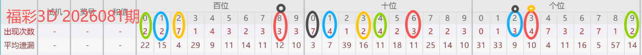 2026079期开奖号码223,我们可以看出近30期百位2出现7次,十位3出现2次,个位3出现4次。