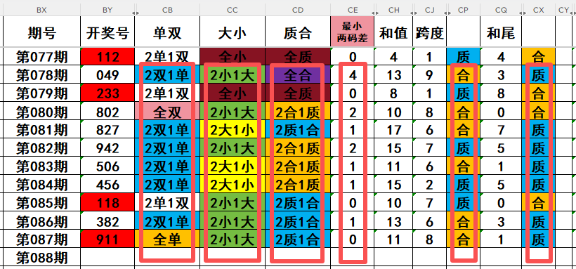4,最近10天当中,最小两码差0开出3次,最小两码差1开出4次,最小两码差2开出2次,最小两码差3开出0次,