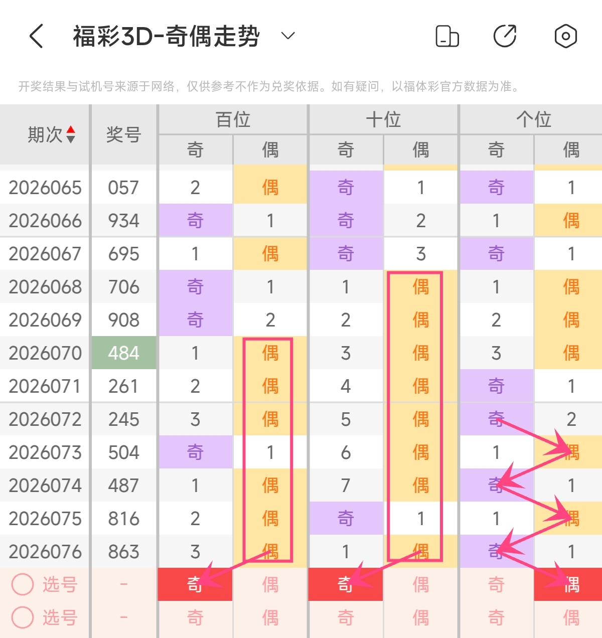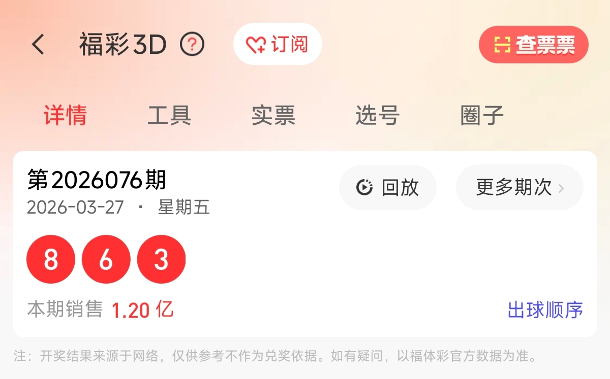 首先让我们回顾一下上期福彩3D第2026076期开奖号码为863,为组六形态,大小比为2:1,奇偶比为1:2,跨度为5,和值为17。