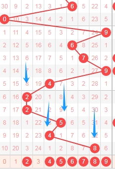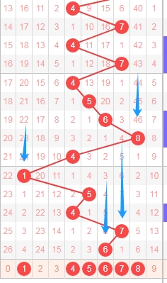 上图是福彩3D从左到右定位第一位数字走势图,我标志出来的数字都是遗漏周期小的数字,标志出来的蓝色箭头都有遗漏周期,上期开出数字8遗漏周期是32期,那么本期可以关注遗漏周期小的数字2456789,个人最看好数字25789。