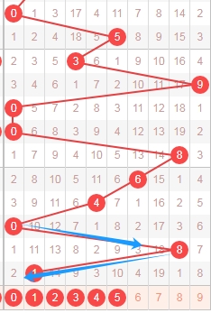 上图是福彩3D从左到右定位第二位数字走势图,我标志出来的蓝色箭头表示跨度,最近两期的跨度都是大跨度,上期数字1从数字8走来跨度是7,那么本期可以关注跨度小的数字,那么就是数字012345,个人最看好数字0345。