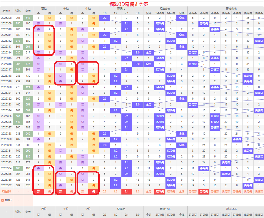 上期奇偶比是1:2,两偶的号码组合方式,从近五期的奇偶数出现情况看,奇数出现8次,偶数出现7次,奇数偶数号码出现较平均,本期侧重两奇的号码组合,侧重奇奇偶或奇偶偶的号码组合方式,根据奇偶形态做五码定位13579/13579/02468或13579/02468/02468