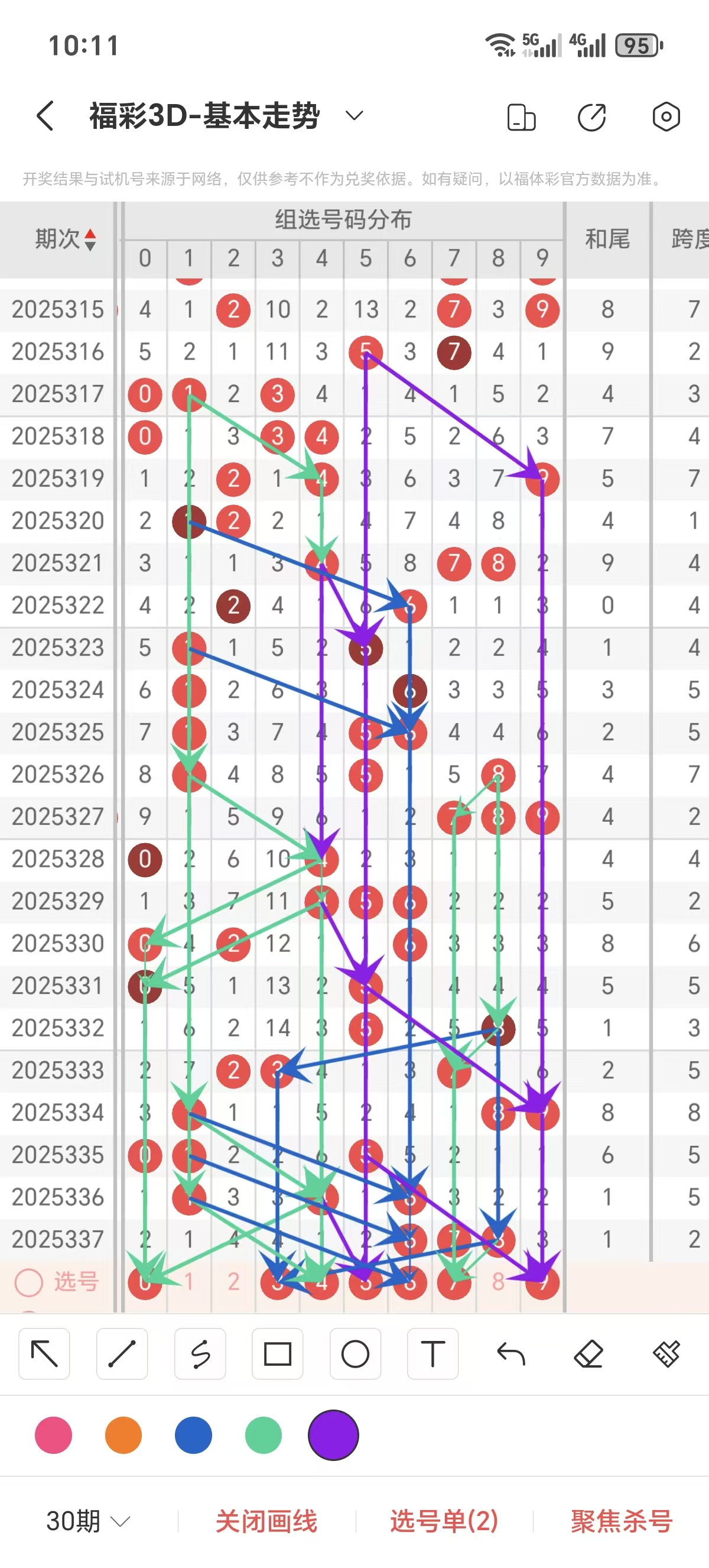 跨度通常情况下在五期之内重复一个跨度的概率很高,近五期重复了5的跨度,近五期跨度为5/8/5/5/2,近期2路的跨度较热,上期是2路的跨度,本期要侧重跨度以5/6/7跨为主的号码组合。可以从跨度方面选择相应的双胆码组合,双胆码的选取要根据近期和历史的走势进一步的分析选取。