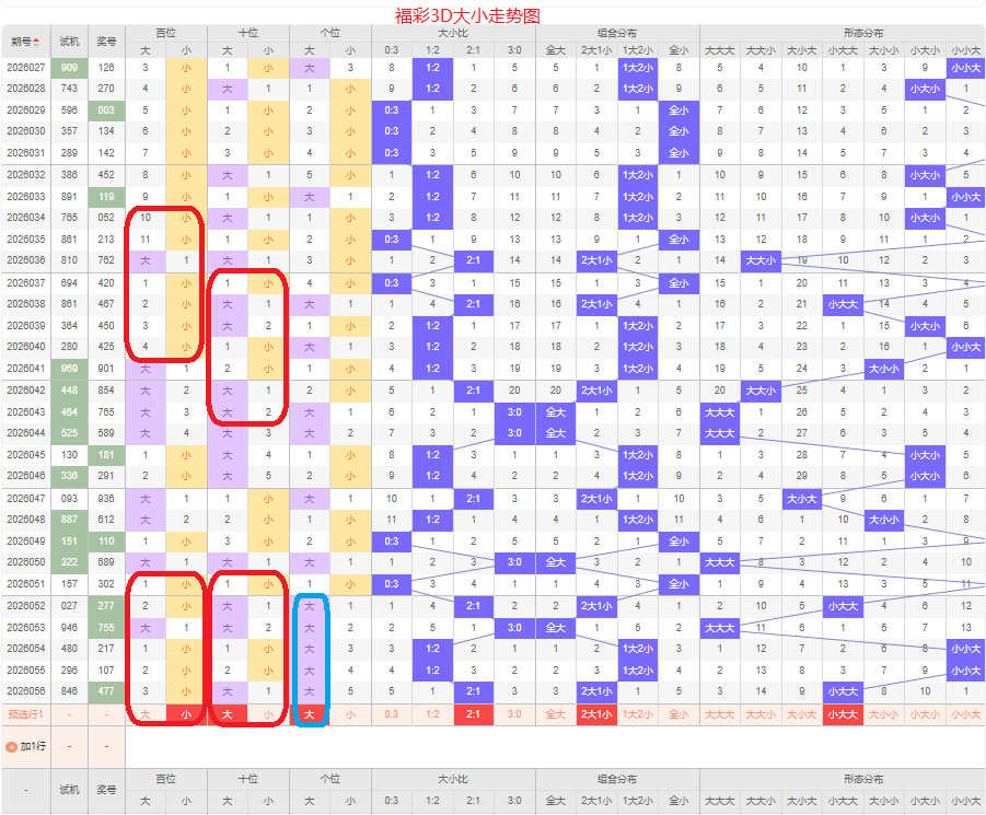 上期大小比为2:1,两大的号码组合方式,从近五期出现情况看,大号码出现9次,小号码出现6次,大号码出现较多,本期侧重两大的号码组合,本期百位侧重小号码,十位侧重大号码,个位要侧重看大,侧重小大大或者大大小的号码组合,根据大小做五码定位01234/56789/56789或56789/56789/01234