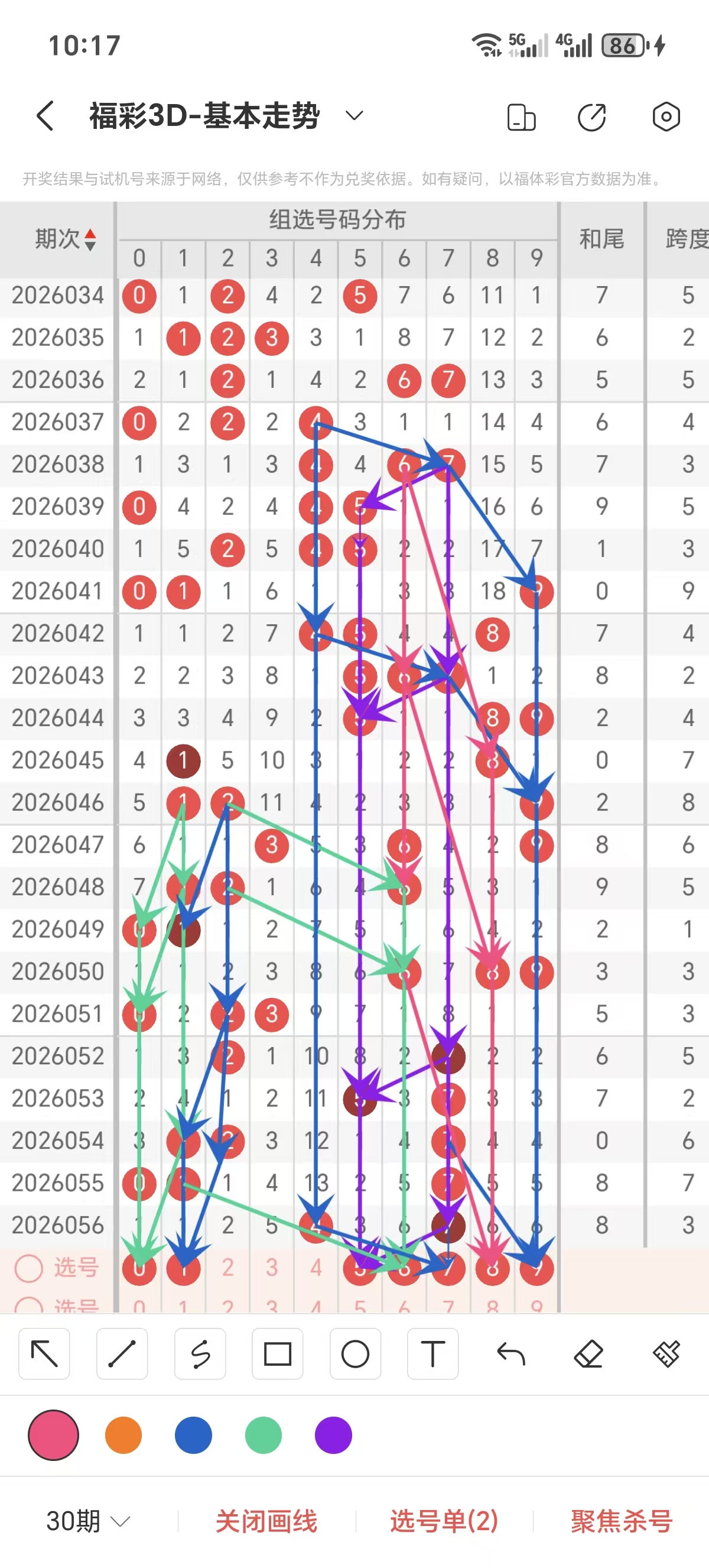 跨度通常情况下在五期之内重复一个跨度的概率很高,近五期没有重复的跨度,近五期跨度为5/2/6/7/3,近期02路的跨度较热,上期是0路的跨度,本期要侧重跨度以6/8/9跨为主的号码组合。可以从跨度方面选择相应的双胆码组合,双胆码的选取要根据近期和历史的走势进一步的分析选取。