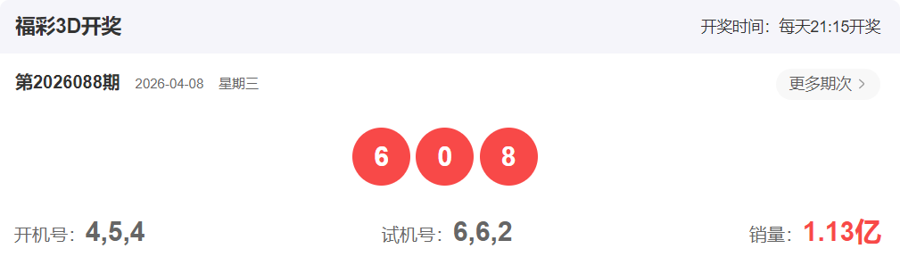 各位一起彩的朋友,大家好、我是福星研彩我们来回顾一下上期福彩3D,2026088期福彩3D开出奖号608,属性为组六。