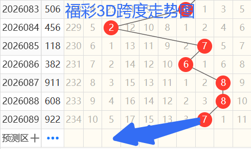 2)我们来看跨度;还是以85期——89期为例,如图依次是76887跨度,按照路数转换关系来看,那么跨度我们暂定258369跨 ,本期个人比较看好3 2跨。