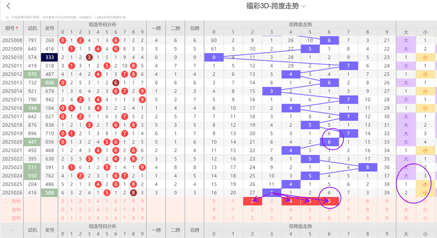 通过观察跨度及跨度属性走势可以发现:近10期内跨度小数号码出号后,较少连开,上期开出了小数跨度3,本期跨度大概率会开出大数号码,因此本期跨度应该考虑大数号码出号。结合上述跨度走势图来看,本期跨度看好56,防邻号24。