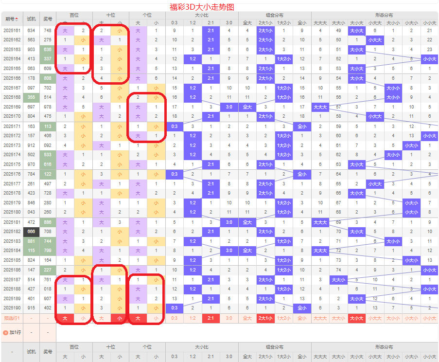 上期大小比为0:3,全小的号码组合方式,从近五期出现情况看,大号码出现6次,小号码出现9次,大号码出现较少,本期侧重两大的号码组合,本期百位侧重大号码,十位本期走小的概率很大,个位要侧重看大,侧重大小大或者小大大的号码组合,根据大小做五码定位56789/01234/56789或01234/56789/56789