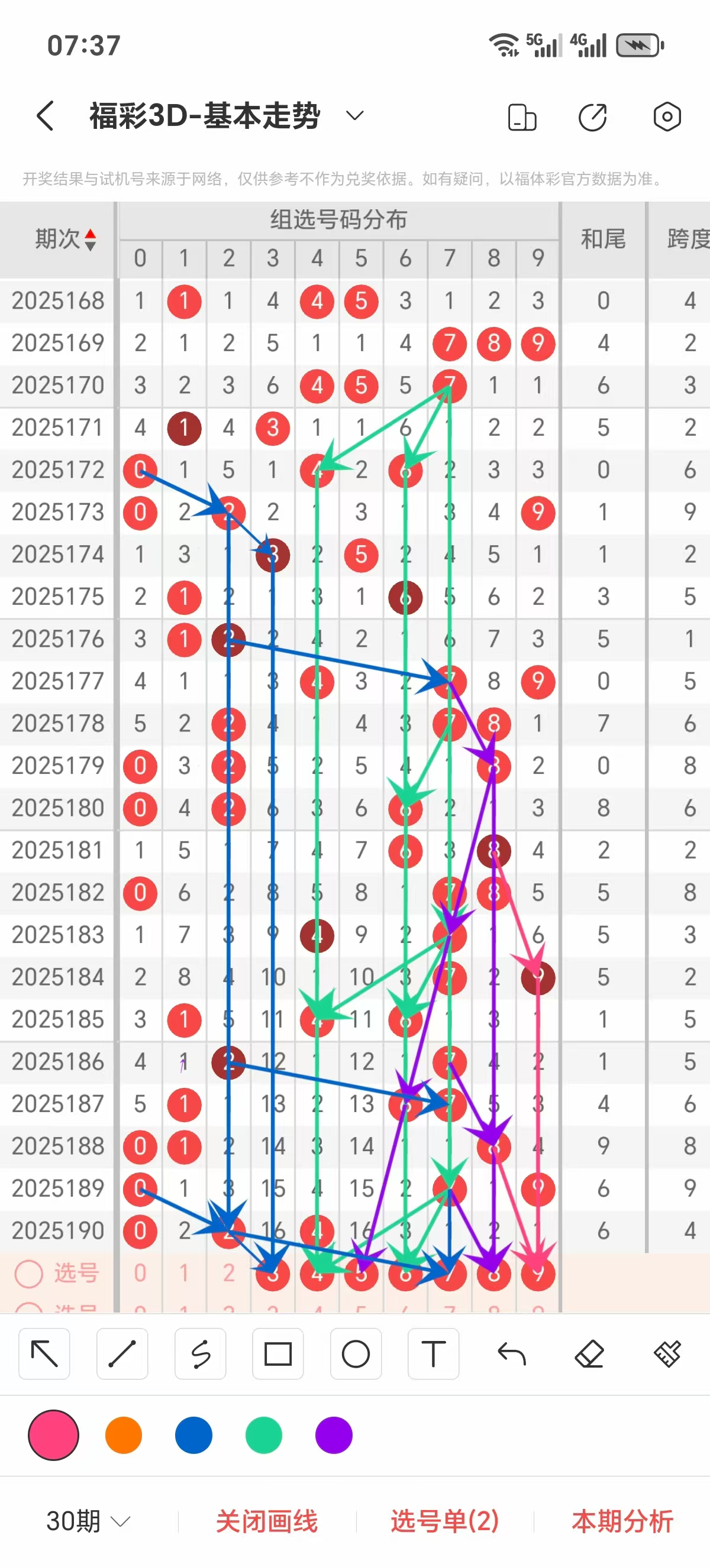 跨度通常情况下在五期之内重复一个跨度的概率很高,近五期没有重复的跨度,近五期跨度为5/6/8/9/4,近期02路的跨度较热,上期是1路的跨度,本期要侧重跨度以3/5跨为主的号码组合。可以从跨度方面选择相应的双胆码组合,双胆码的选取要根据近期和历史的走势进一步的分析选取。