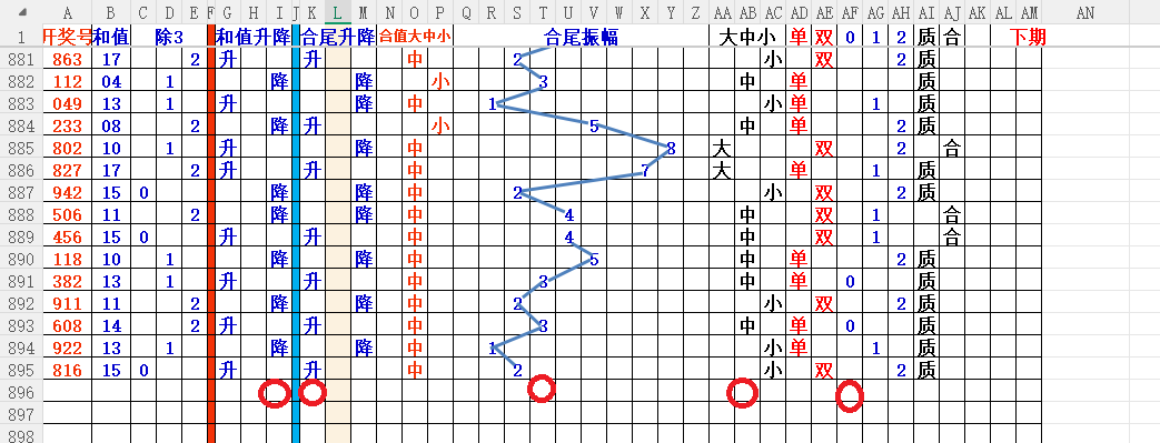 如上图3,和值升降平分析,和值升概率大,小于15和值