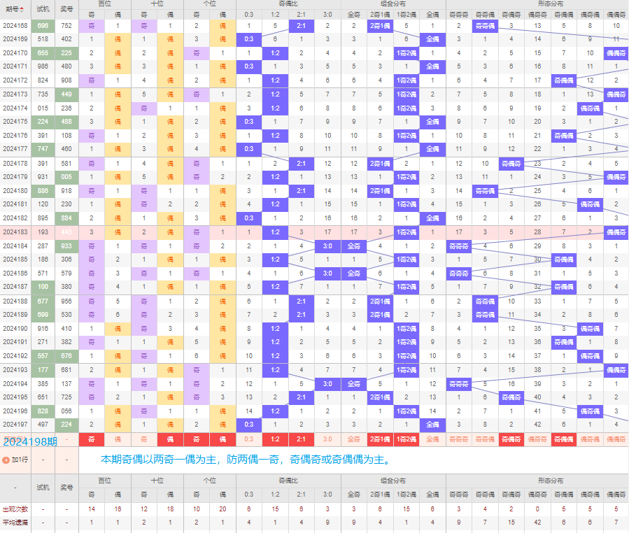 本期侧重两奇一偶,其次防两偶一奇,百位奇,十位奇,个位奇偶。