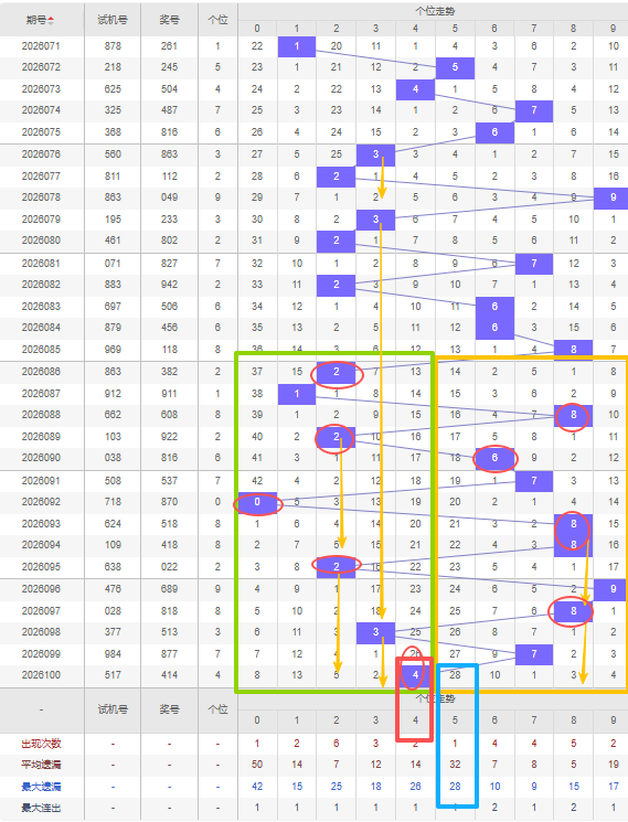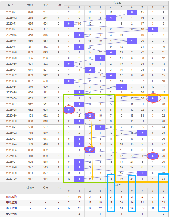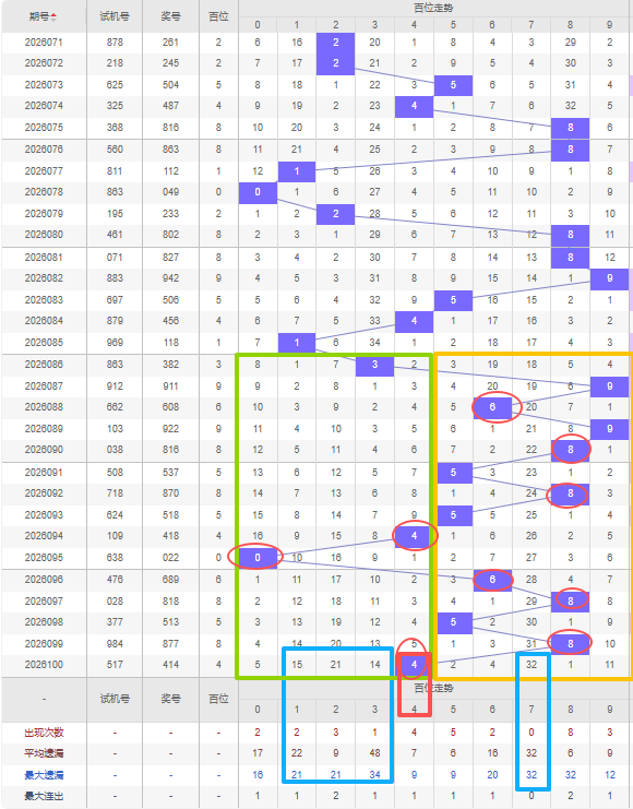 福彩3D第2026101期百位首先分析本期百位奇偶数的形态,可以看到近15期开出偶数号9期,奇数号6期,开出奇数号的概率比开出偶数号的概率相差不大,近五期开出了4期偶数号上一期开出偶数4号,根据以上所述本期看好开出奇数号。推荐考虑遗漏期数较大的奇数号,比如冷号可以考虑3号、7号都已经遗漏十期以上,而且7号是百位遗漏期数最大的号,3号同时也是形成邻号,开出几率较大建议考虑防冷号开出。杀号建议定在偶数号,但2号都遗漏十期以上达到了最大遗漏期数,可以考虑防冷号开出。另外近十五期只出现一次重号,可以防重号开出考虑4号。