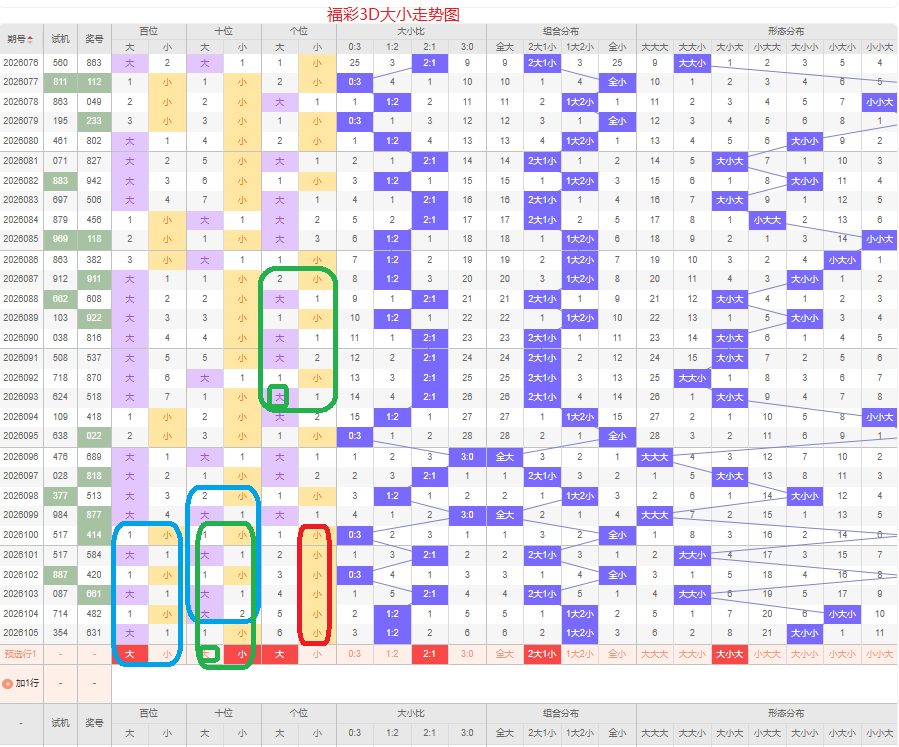 上期大小比为1:2,两小的号码组合方式,从近五期出现情况看,大号码出现6次,小号码出现9次,大号码出现较少,本期侧重两大的号码组合,本期百位侧重大号码,十位侧重小号码,个位要侧重看大,侧重大小大或者小小大的号码组合,根据大小做五码定位56789/01234/56789或01234/01234/56789