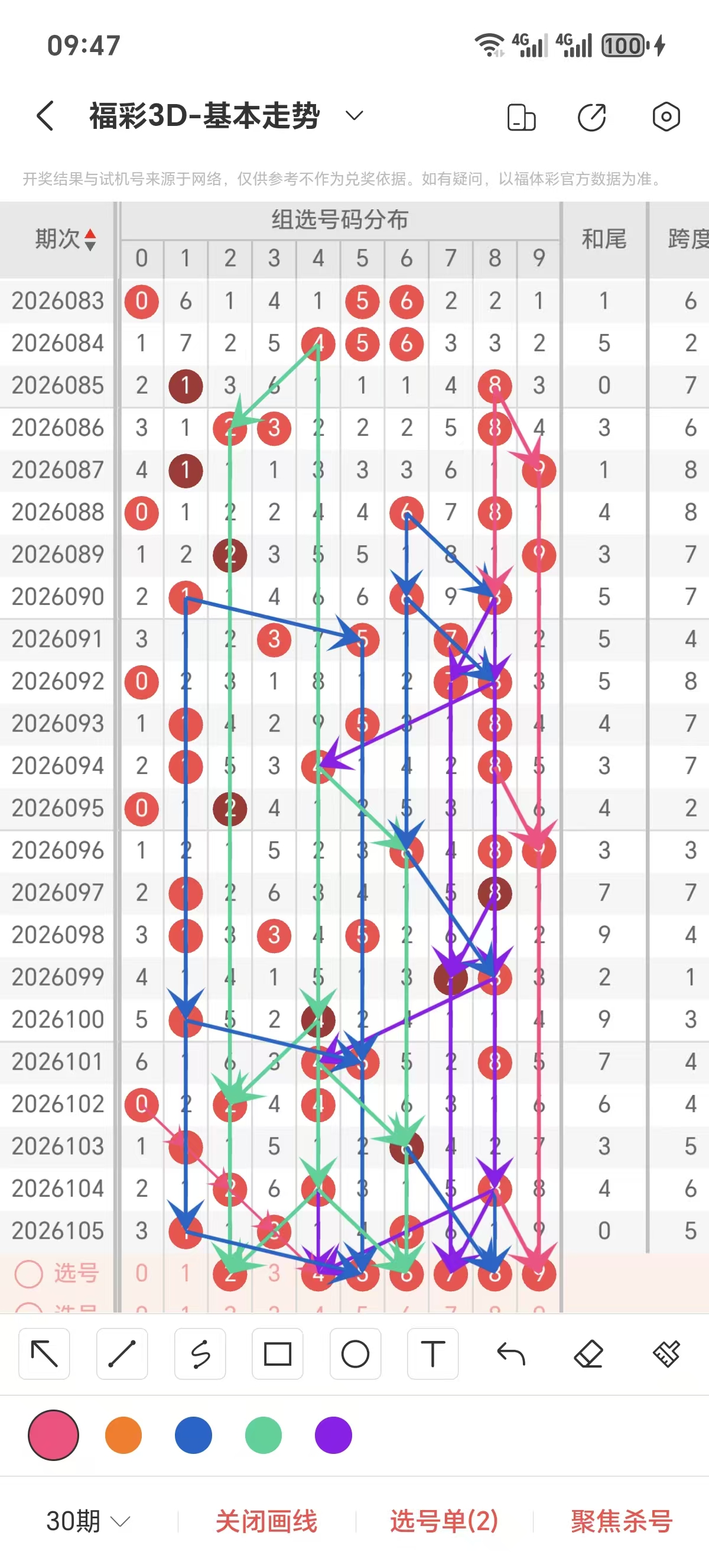 跨度通常情况下在五期之内重复一个跨度的概率很高,近五期重复了4/5的跨度,近五期跨度为4/4/5/6/5,近期12路的跨度较热,上期是2路的跨度,本期要侧重跨度以4/5/7跨为主的号码组合。可以从跨度方面选择相应的双胆码组合,双胆码的选取要根据近期和历史的走势进一步的分析选取。