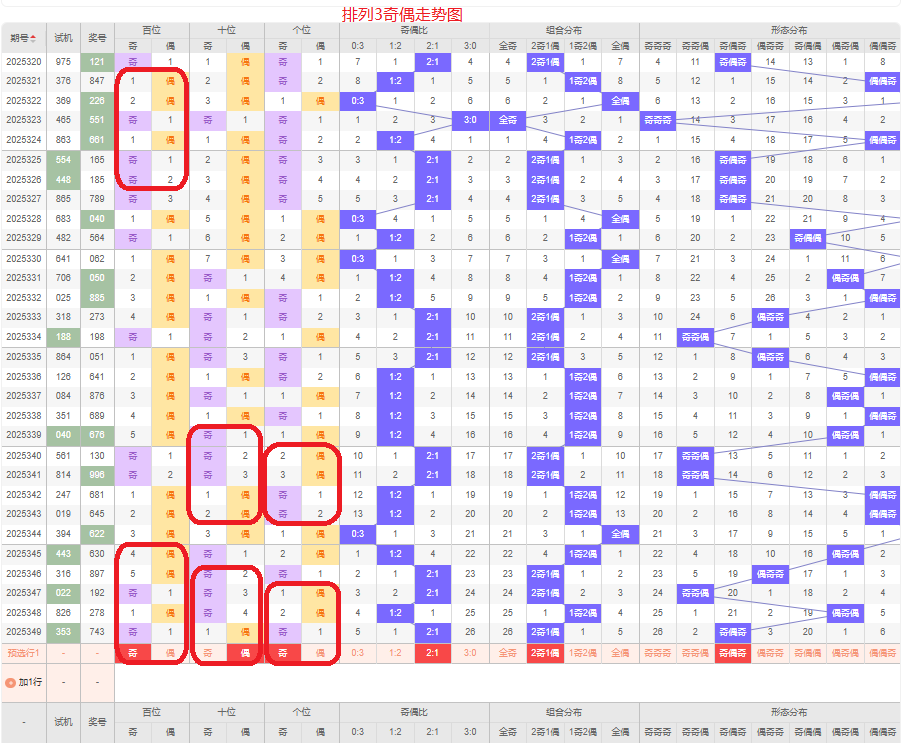 上期奇偶比是2:1,两奇的号码组合方式,从近五期的奇偶数出现情况看,奇数出现8次,偶数出现7次,奇数偶数号码出现较平均,本期侧重两奇的号码组合,侧重奇偶奇或奇偶偶的号码组合方式,根据奇偶形态做五码定位13579/02468/13579或13579/02468/02468