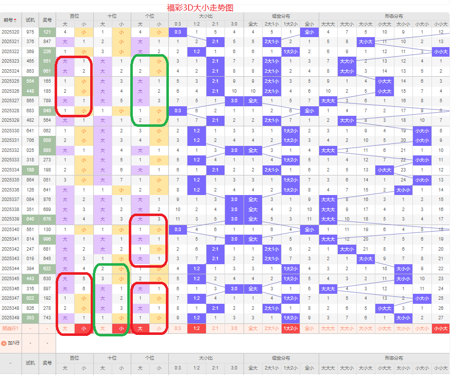 上期大小比为1:2,两小的号码组合方式,从近五期出现情况看,大号码出现8次,小号码出现7次,大小号码出现较平均,本期侧重两小的号码组合,本期百位侧重小号码,十位侧重小号码,个位要侧重看大,侧重小小大或者小大大的号码组合,根据大小做五码定位01234/01234/56789或01234/56789/56789