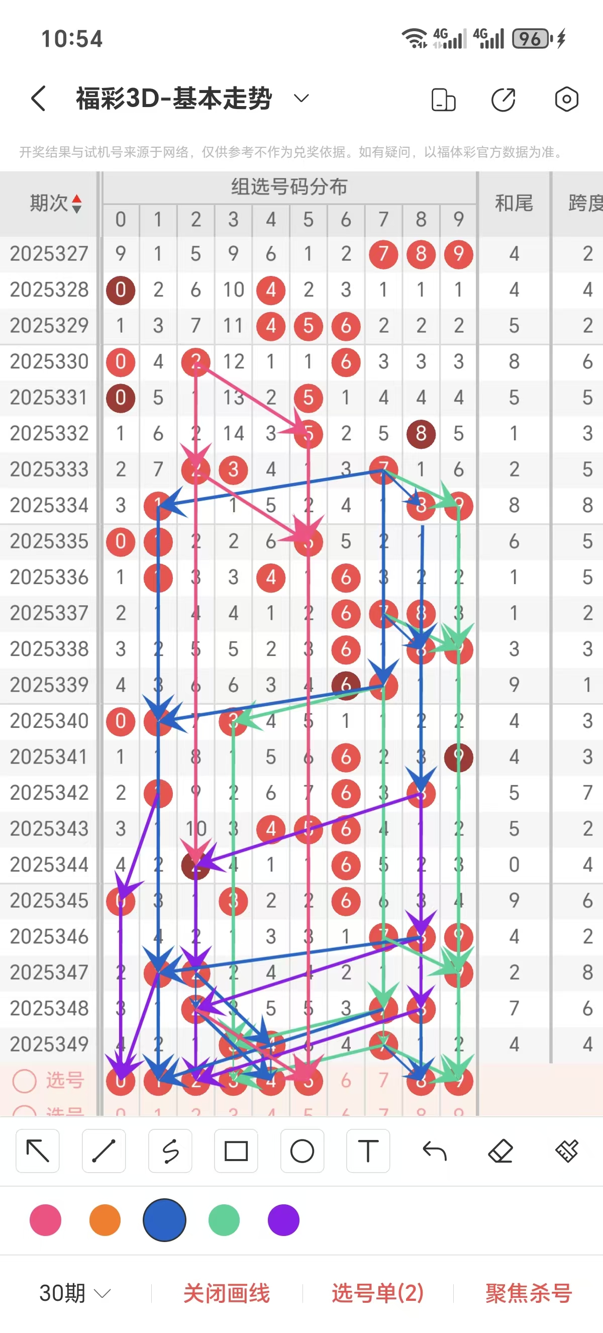 跨度通常情况下在五期之内重复一个跨度的概率很高,近五期重复了6的跨度,近五期跨度为6/2/8/6/4 ,近期02路的跨度较热,上期是1路的跨度,本期要侧重跨度以5/6跨为主的号码组合。可以从跨度方面选择相应的双胆码组合,双胆码的选取要根据近期和历史的走势进一步的分析选取。
