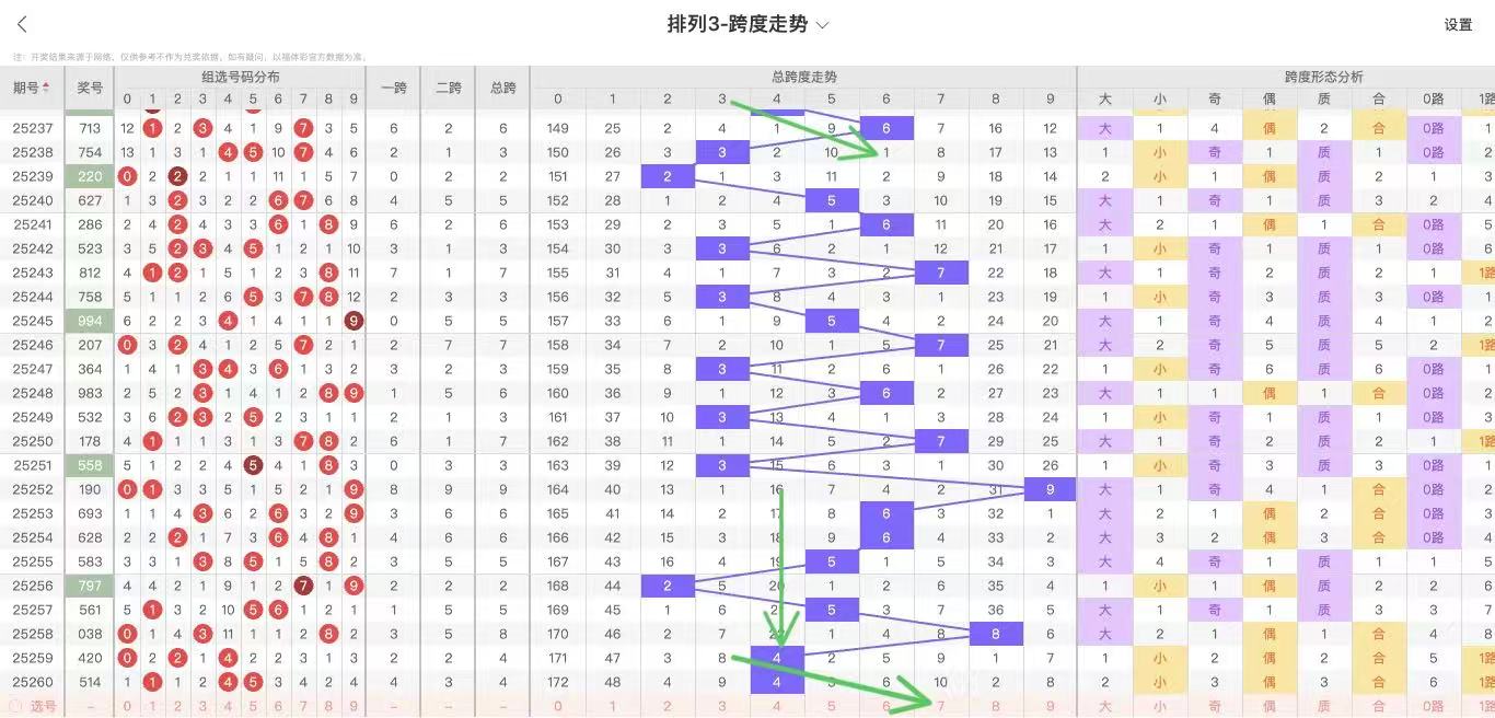10期内跨度走势为:3-9-6-6-5-2-5-8-4-4,10期内大小跨比:6:4,奇偶跨比4:6,百期内跨度4共开出的17次,下期数据:2 5 1 7 1 3 8 9 5 4 2 2 2 2 6 4近期度较热,考虑跨度4开出后容易出大跨度,近期大小规律下大:奇:质,所以接下来继续大跨,奇跨度表现!