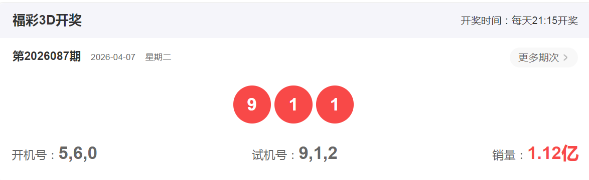 福彩3D2026年4月7日第087期开奖号码是911,组三形态,和值11,跨度8,奇奇奇,大小小