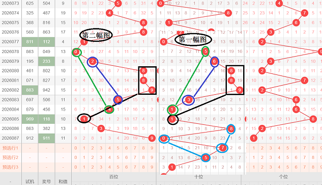 这是一张近期大盘走势分析图,利用十位来分析百位,为了方便和大家更清楚的分析清楚,我把图叠加了,分成了第一幅图和第二幅图,我们发现在第一幅图中十位出现了黑颜色框889间隔两期黑颜色1,在第二幅图中百位同样出现了黑颜色框889间隔两期黑颜色1,在第一幅图中十位绿颜色线条和蓝颜色线条都是由大到小的排列方式,蓝颜色线条63是两码差3,绿颜色线条51是两码差4,在第二幅图中绿颜色线条和蓝颜色线条确是由小到大的排列方式,绿颜色线条04是两码差4,蓝颜色线条两码差3,也就是说第一幅图中和第二幅图中蓝颜色线条和绿颜色线条都属于对称,在第一幅图中十位先出现了青颜色线条8间隔一空7,青颜色线条8和7两个数字相加等于5尾,紧接着青颜色线条0间隔一空5,青颜色线条0和5两个数字相加也等于5尾,也就是说两个青颜色线条相加的和值尾属于对称,文字表达可能不太清楚,大家可以观看上面的视频