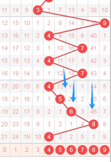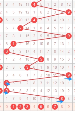 上图是福彩3D开奖号码从左到右第三位数字走势图,我标志出来的蓝色小箭头表示的都是遗漏周期,最近几期开出的遗漏周期大,数字8遗漏周期是46期,所以本期可以继续关注遗漏周期小的数字456789,个人最看好数字478。