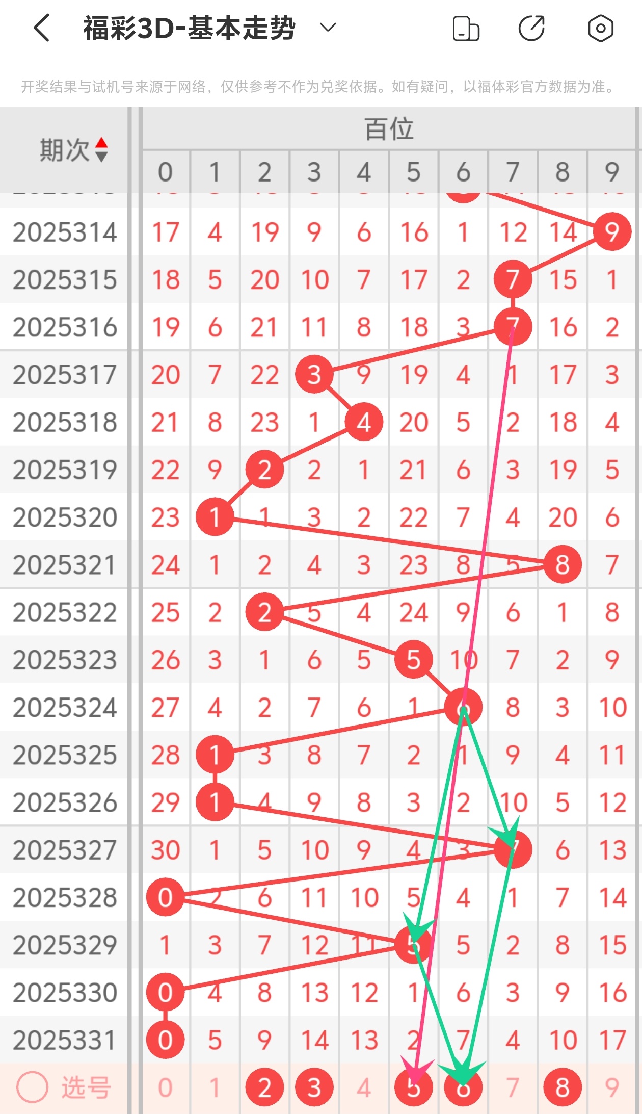 上期百位开出0,本区与上期的跨度为0,本期我们可以从上面走势图中看出选号的思路,5为斜连走势跨度为五,6为对称形态走势跨度为六,综合以上分析,本期百位推荐:23568