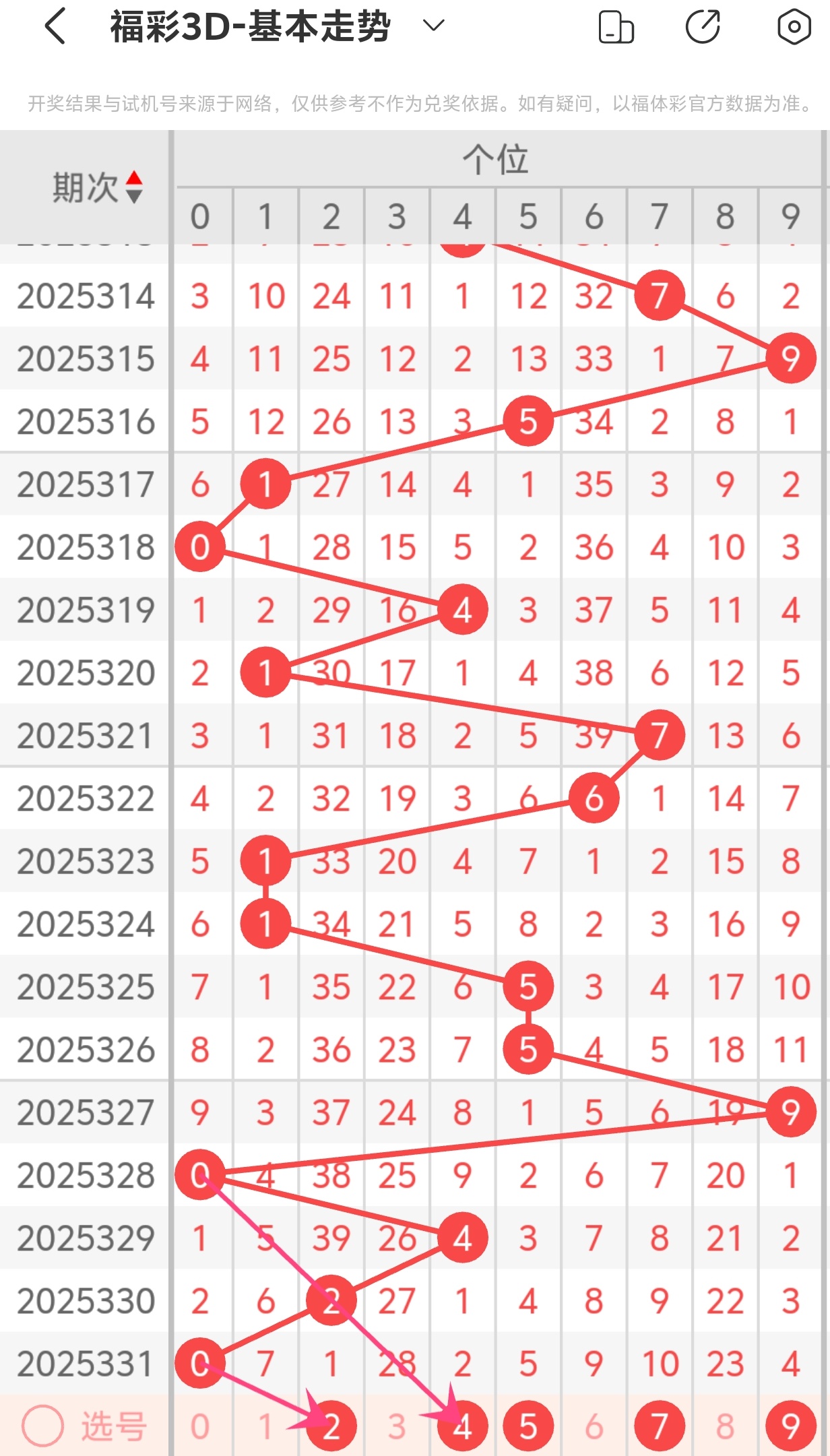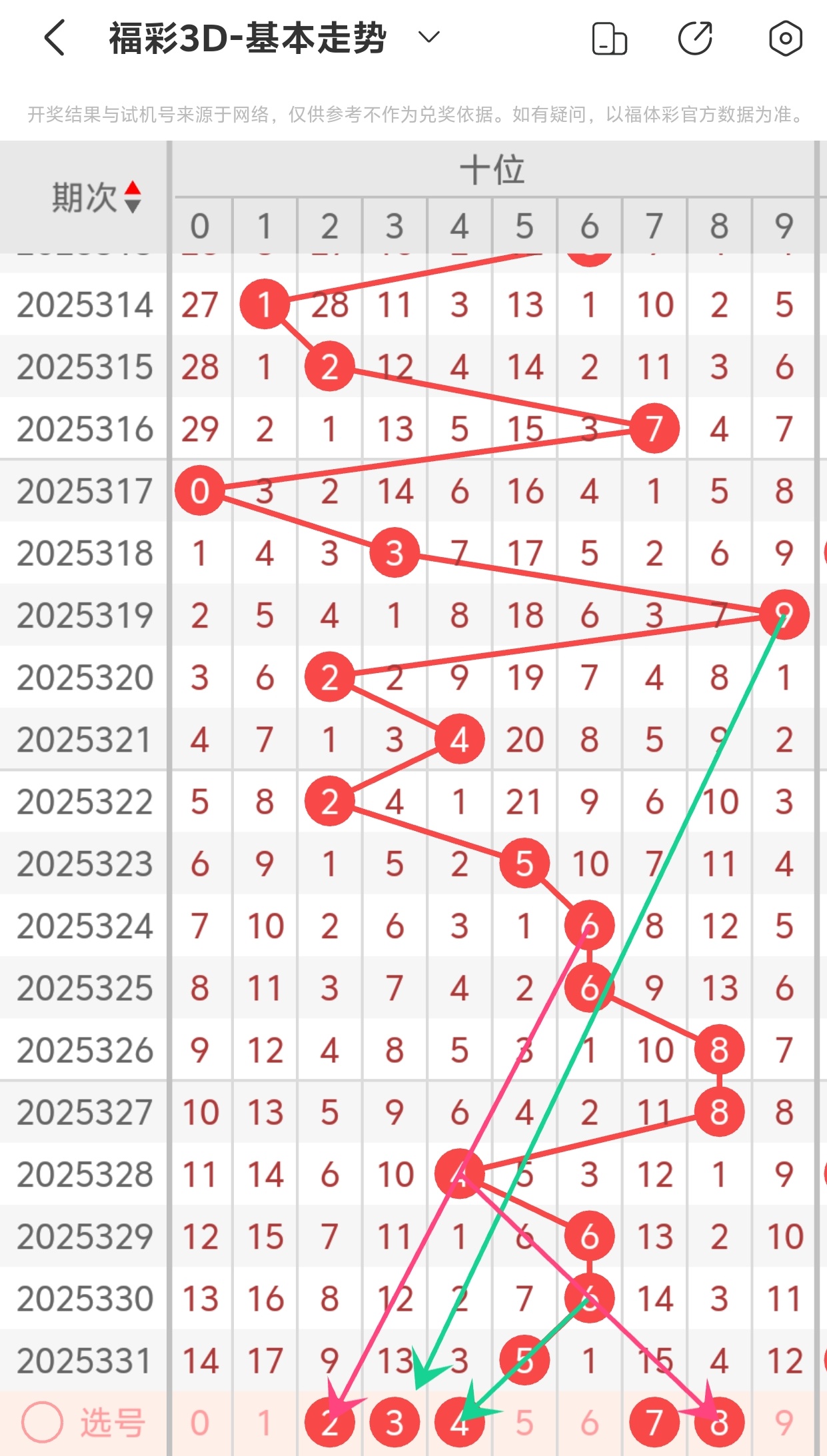 上期个位开出0,本区与上期的跨度为2,本期我们可以从上面走势图中看出选号的思路,2为隔期回补走势跨度为二,4为斜连走势跨度为四,综合以上分析,本期个位推荐:24579