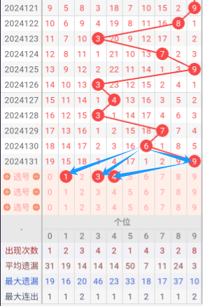 现在我给大家分析下,本期个位可能开出的号,上期开出了9,121期开出了9号码球,122期开出了8号码球,123期开出了3号码球,124期开出了8号码球,125期开出了9号码球,126期开出了3号码球,127期开出了4号码球,128期开出了3号码球,129期开出了7号码球,130期开出了6号码球,131期开出了9号码球,根据这几期的走势和历史50期内的走势对比,我们可以先考虑本期可能会出小号,下面我给大家推存个位可能开出的几个号,个人比较看好134,个位我们就先暂定这两个号。本期重点关注1-7之间的号码,同时关注遗漏期数较大的号码。按最近遗漏走势,开了遗漏期数较大之后开遗漏期数小的可能性比较大。