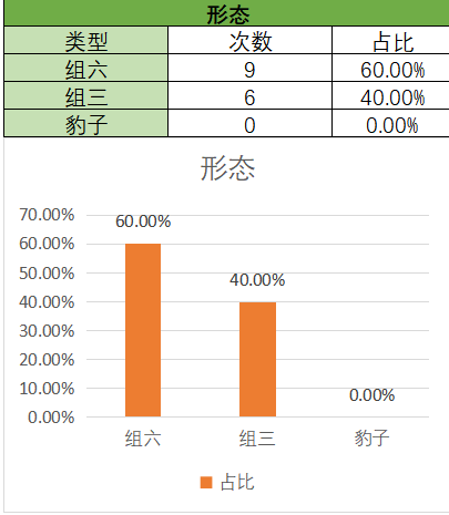 上期开的是组六,各个类型占比没有变化。通过图示可以看到,组六在15期内开了9期,组三开了6期。目前还是组六占比是最优的本期关注组六,防组三