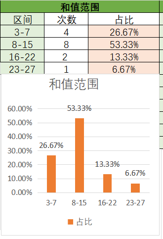 上期和值是8,处在8~15之间,其中16~22占比变小,8~15占比变大。目前是8~15的和值占比是最多的,优势是最好的其次是3~7,然后是16~22之间,最后是23~27。本期看好和值在8~15之间,其次是16~22