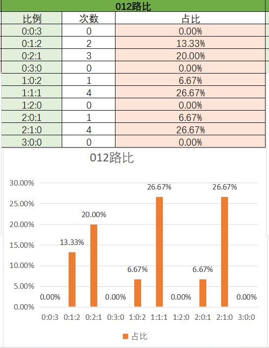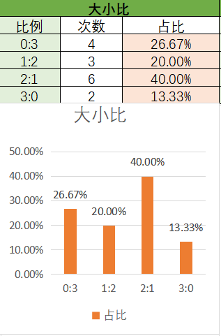 上期大小比为1:2,其中1:2占比变大,2:1占比变小。可以看到近15期内2:1优势最好的其次是0:3,然后是1:2,最后是3:0。本期看好2:1开出,其次是1:2