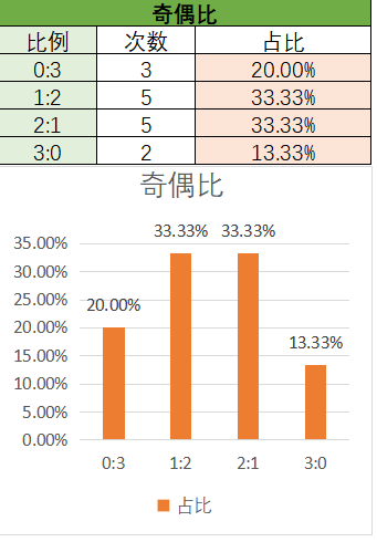 上期奇偶比为0:3,其中0:3占比变大,2:1占比变小。近15期内1:22:1优势最大,最后是3:00:3上期开了0:3奇偶比,本期看好2:1奇偶比的开出,其次是1:2