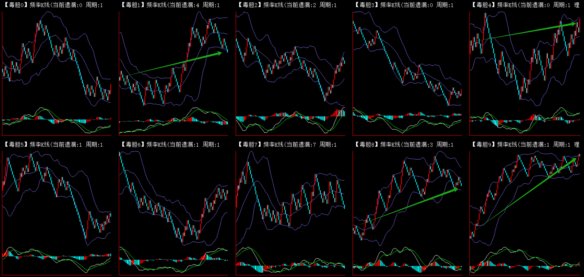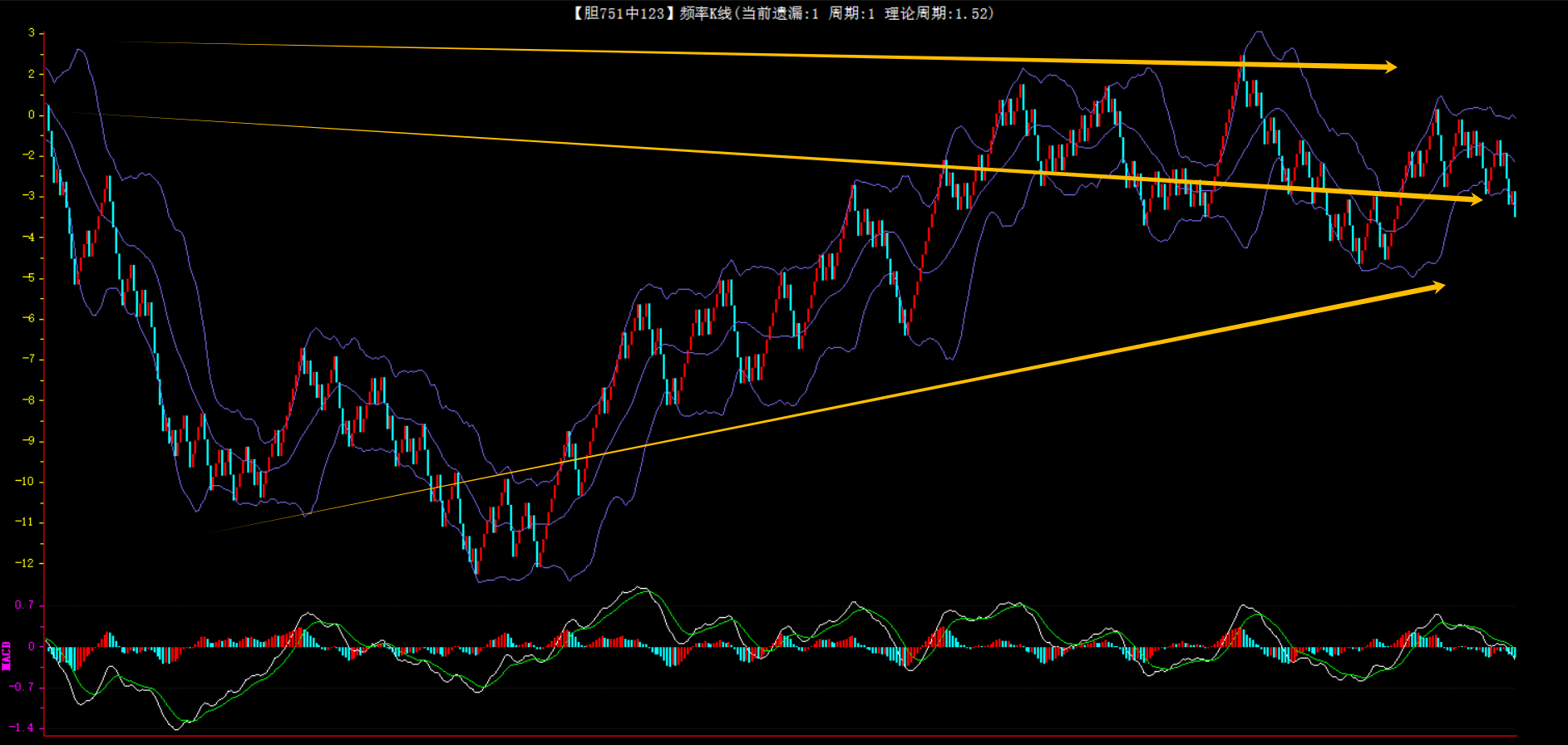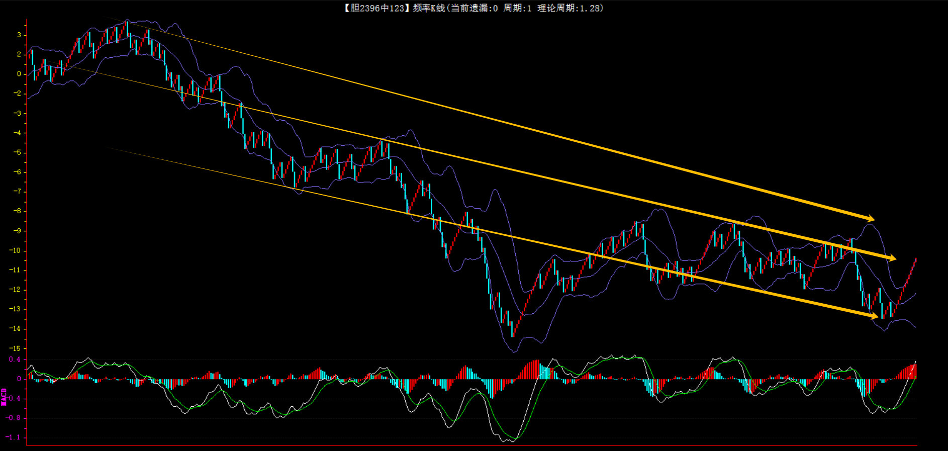 整体趋势下行,上边沿线趋势向下,下边沿趋势向上,节点震荡,当前遗漏1期,本期防守。