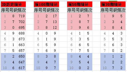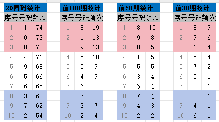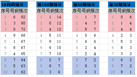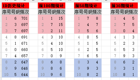 通过历史数据统计十位至今的所有号码排序情况,并分别统计十位的前100期,前50期,前30期的号码分布情况,最终汇总成一张历史频次表,如图所示:
