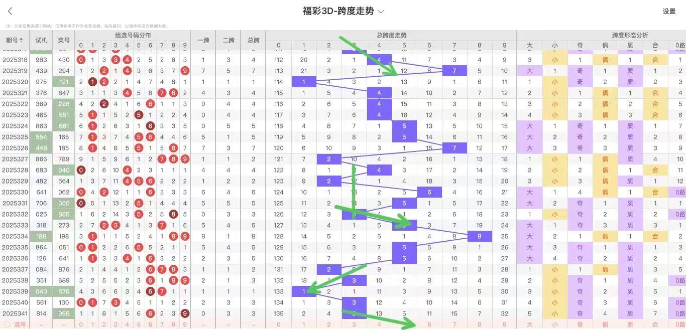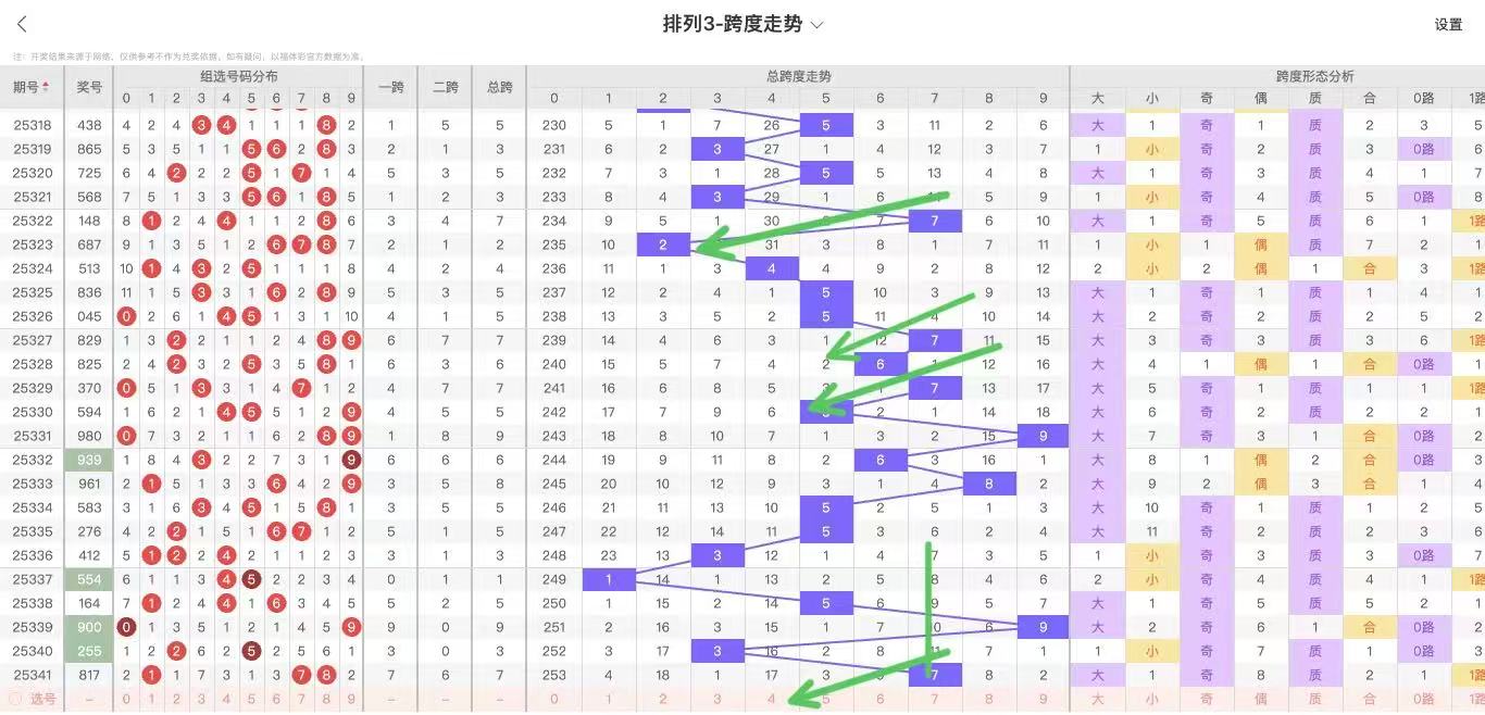10期内跨度走势为:6-8-5-5-3-1-5-9-3-7,10期内大小跨比:7:3,奇偶跨比8:2,百期内跨度7共开出的14次,下期数据:3 3 3 2 5 2 9 5 7 2 2 6 5 近期度较热,考虑跨度7开出后容易出大跨度,近期大小规律下大:偶:合,所以接下来继续大跨,偶跨度表现!