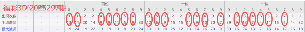 2025296期开奖号码573,我们可以看出近30期百位5出现3次,十位3出现2次,个位7出现7次。