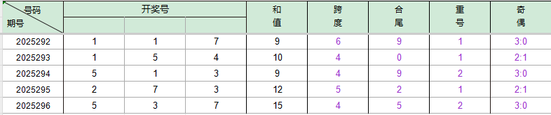 2025295期开奖号码273,我们可以看出近30期百位2出现2次,十位7出现4次,个位3出现5次。