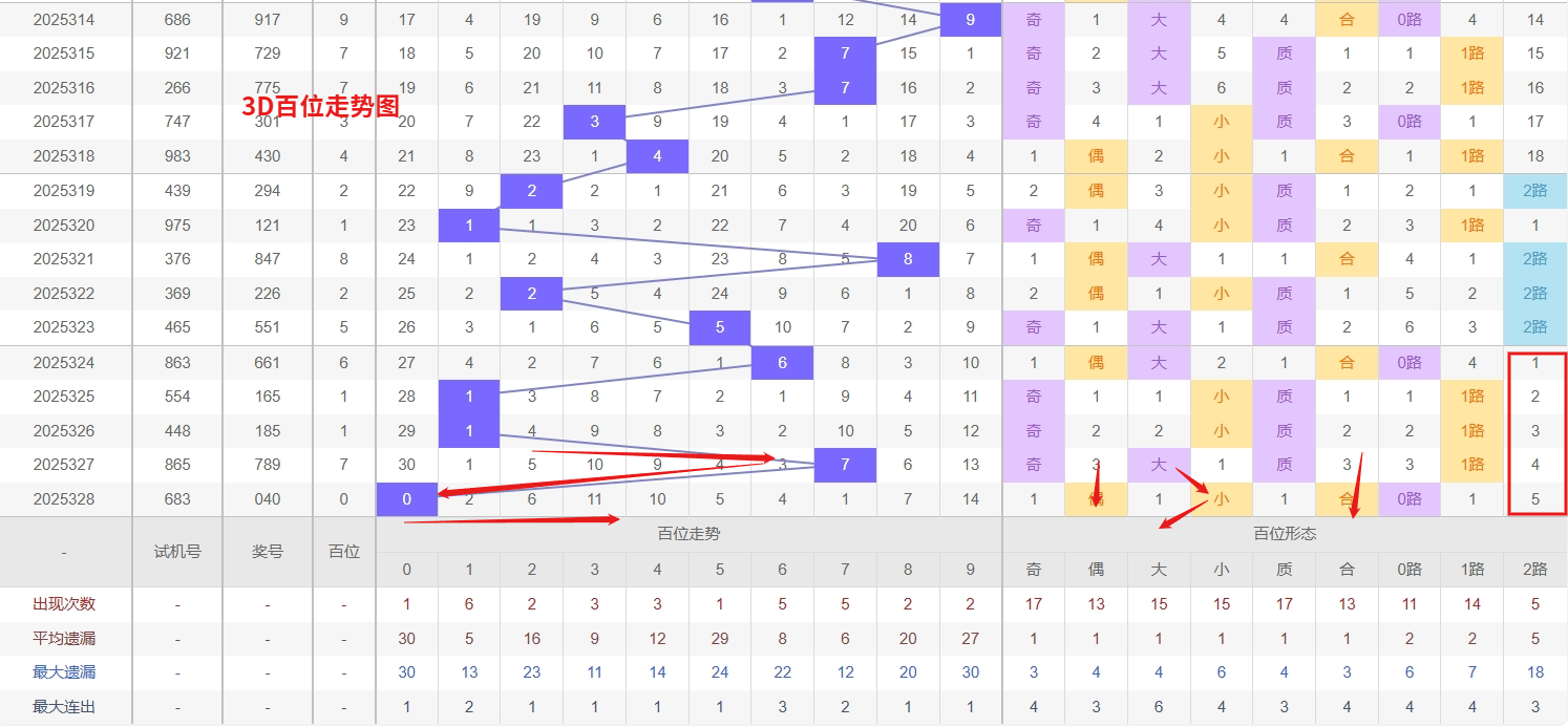 福彩3D百位分析:第2025328期百位开出号码0属于小偶数,从上面百位走势图上可以看出近100期大小比约为51:49奇偶比约为52:48。近期数据还是比较极端的符合文章开头介绍的求均衡规律非等量现象。但这种均衡不会持续最终会被偏态运行打破,然后循环往复。但短期内大小相差7点,大数过热小数有回补需求本期个人认为走小数的概率更高。上期百位落号“0”号球,在百位号码开出0路号码0后向小数方向走出7个振幅。那么通过分析上期百位落位号码分析,号码走出7个振幅,号码走为小偶数,开出0路号码0。通过对百位落号趋势来分析,百位号码落位前端,通过对近10期的走势来看百位号码大小交替频繁走2期大数又走3小数,3D百位近期走势,数字0虽然刚刚开出,但此前经历了较长时间的遗漏,其本身具有较强的回补需求,历史数据中类似形态往往存在连下或短期内重复出现的可能,数字5目前处于冷态,遗漏值已累积至较高区间,从概率平衡的角度看,冷号反弹的压力逐渐增大,需开始关注其回补信号。数字6作为近期热号,表现较为活跃,短期内仍有持续或间隔出现的可能,们在百位关注的重点在02456这5个号码球上,百位号码近期奇偶切换频繁,0号球码属于0路号码偶数,现偶数开出过多有继续向偶数的趋势。所以福彩3D第2025329期百位看好02456本文由一起彩钱是生命动力所著,请勿转载