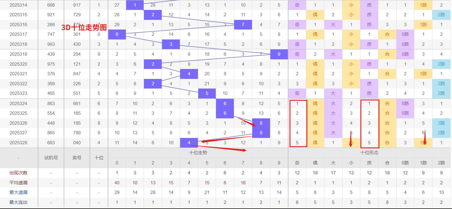福彩3D十位分析:第2025328期十位开出号码4属小偶数号码前端。以历史100期数据为例十位奇偶比约为45比55,大小比约为53比47近期大小相差4点,根据求均衡的规律开出小数的概率比大数高一点。上期我们分析奇数经过连续回补后有走偶数的可能,开出奖号4小偶数符合我们的预期。3D十位的近期走势来看,号码3和5均处于明显的冷态区间,冷号在经历长期遗漏后往往具备较强的反弹动能,短期内出现回补的可能性正在逐渐增大,值得跟踪关注。与此同时,号码8作为当前的热号,表现持续活跃,呈现较强的出号惯性,短期内仍需防范其继续走热或间隔出现。综合判断,十位目前处于“冷热对峙”的格局,在关注热号8持续性的同时,格外警惕冷号3或5的可能回补,所以福彩3D第2025329期十位推荐35789。本文由一起彩钱是生命动力所著,请勿转载