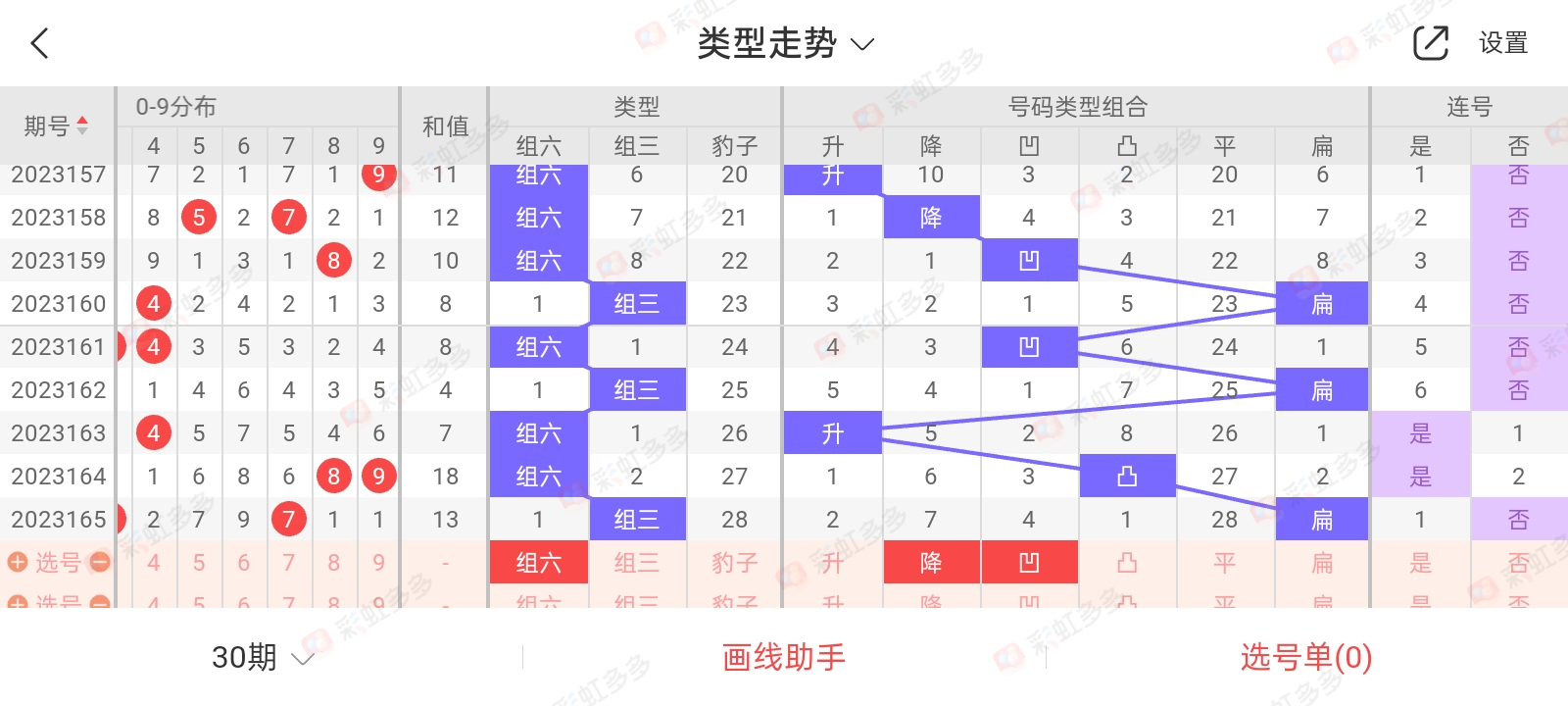 条件一:号码类型杂6半顺组3,形态下降凹下防上升