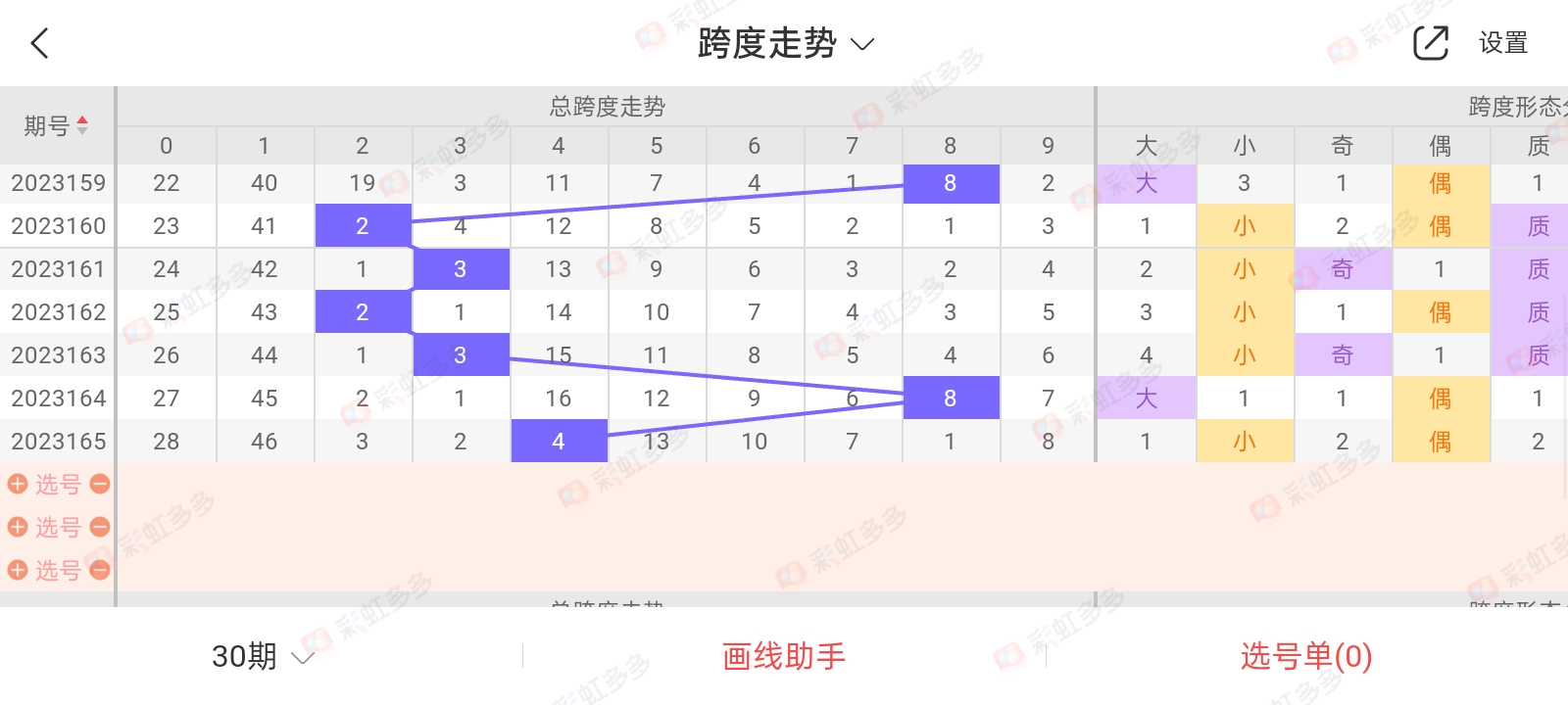 跨度指开奖号码中最大数减去最小数所得的差值,例如143期跨度=9-4=5。