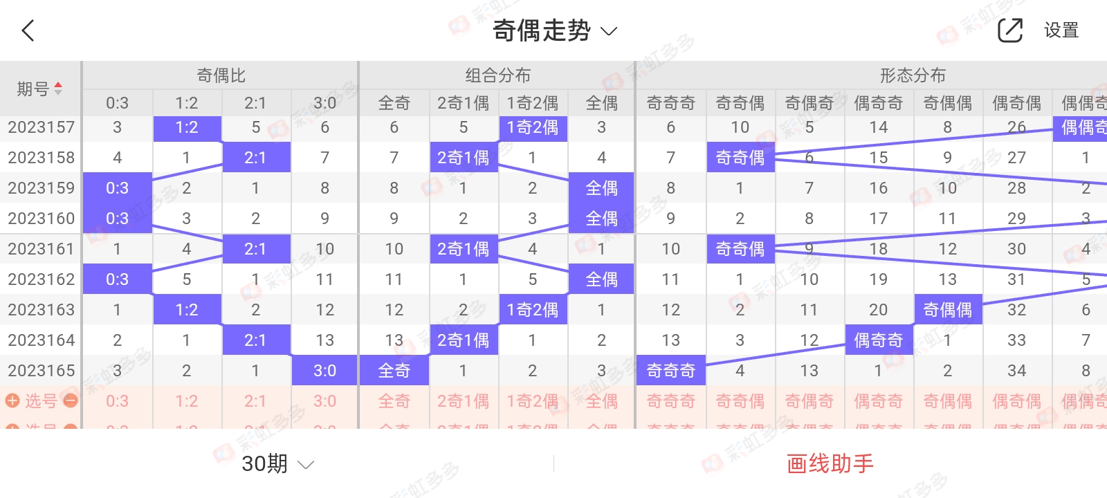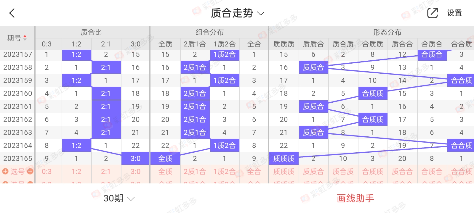 近400期质(12357 )合(04689 )比 623:577,近30期质(12357 )合(04689 )比 47:43;从中不难看出质数热出,上期质(12357 )合(04689 )比3:0,那么本期我们就可以关注一下质数继续热出,质(12357 )合(04689 )比为2:1和3:0。其次则是合数回补,质合比0:3。