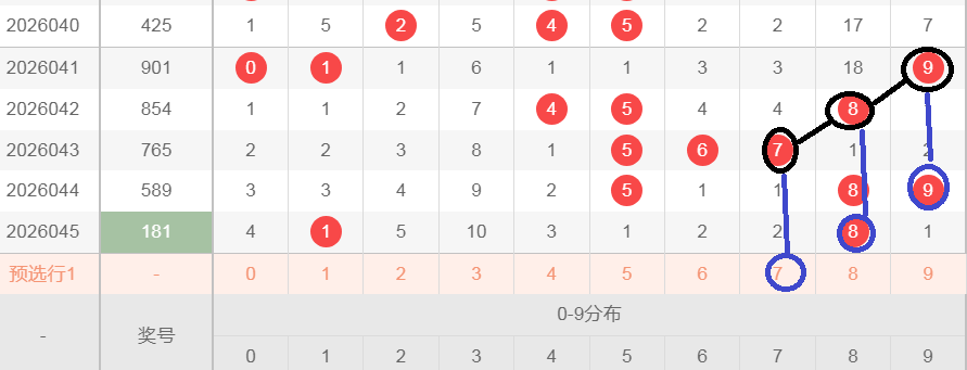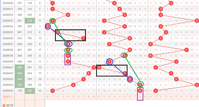 这是一张大盘走势分析图,利用百位来分析十位,在百位出现了黑颜色框2和7,2和7是对应数,2和7是由小到大的排列方式,在十位同样也出现了黑颜色框0和5,0和5也是对应数,0和5也是由小到大的排列方式,在百位出现了蓝颜色线条0和4,0和4是两个偶数,0和4两码差4,0和4是由小到大的排列方式,在十位出现了蓝颜色线条2和6,2和6也是两个偶数,2和6也是两码差4,2和6也是由小到大的排列方式,在百位出现了绿颜色线条1和4,1和4两码差3 ,1和4是由小到大的排列方式,在十位同样出现了绿颜色线条5和8,5和8也是两码差3,5和8也是由小到大的排列方式,在百位出现了紫颜色框4和4,4和4属于直落号,4和4是两个偶数,那么轮到今天,在十位会不会出现紫颜色框8和8呢,8和8也是两个偶数,文字表达不太清楚,大家可以观看上面的视频