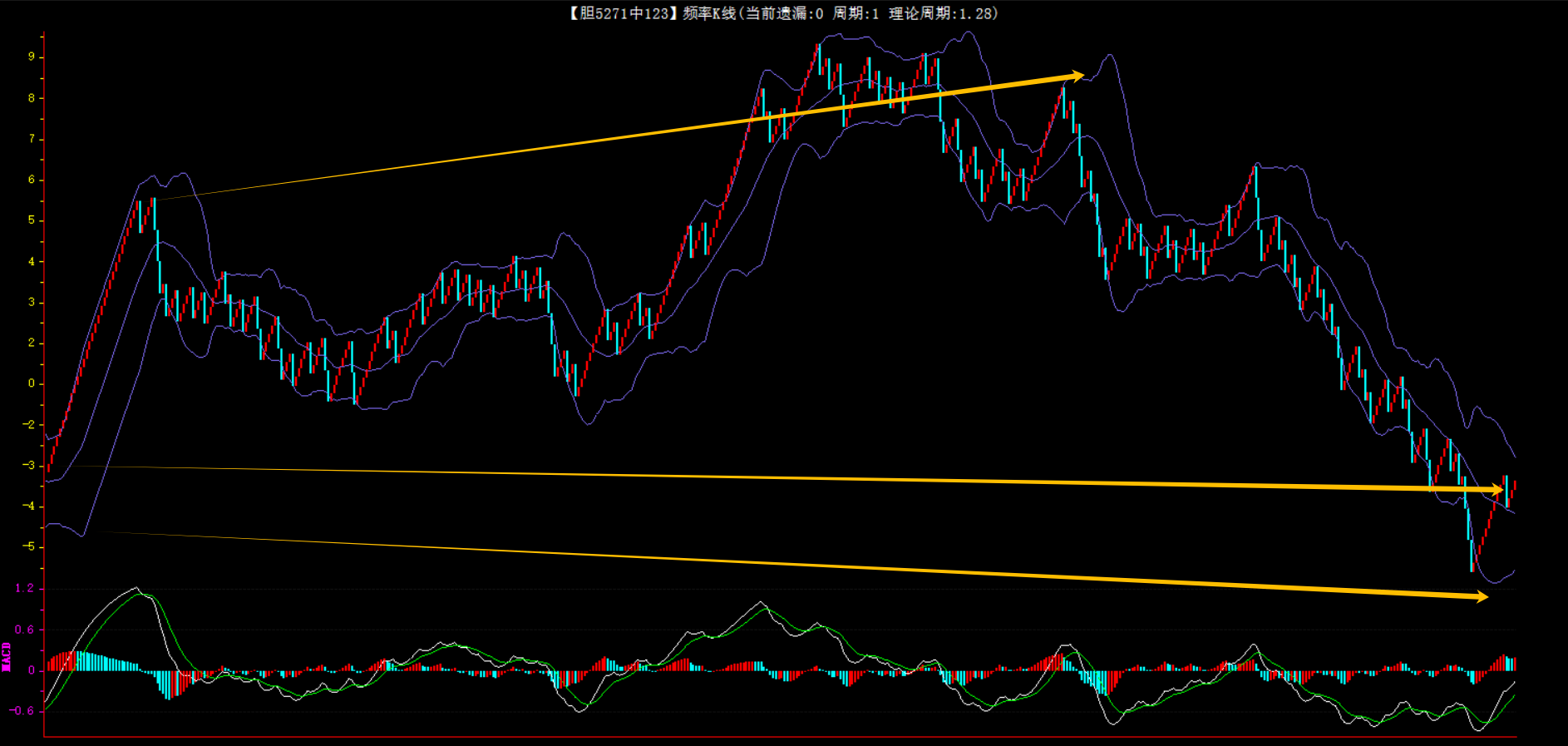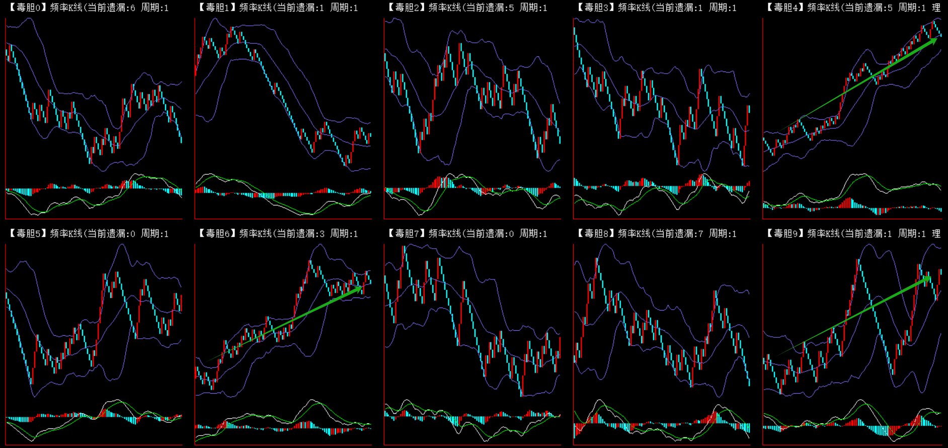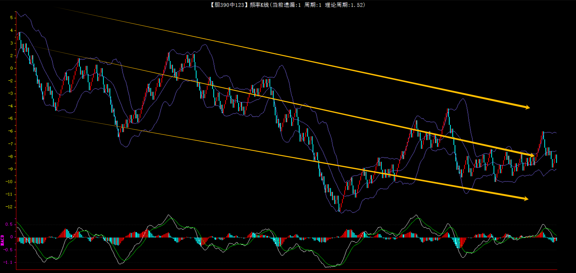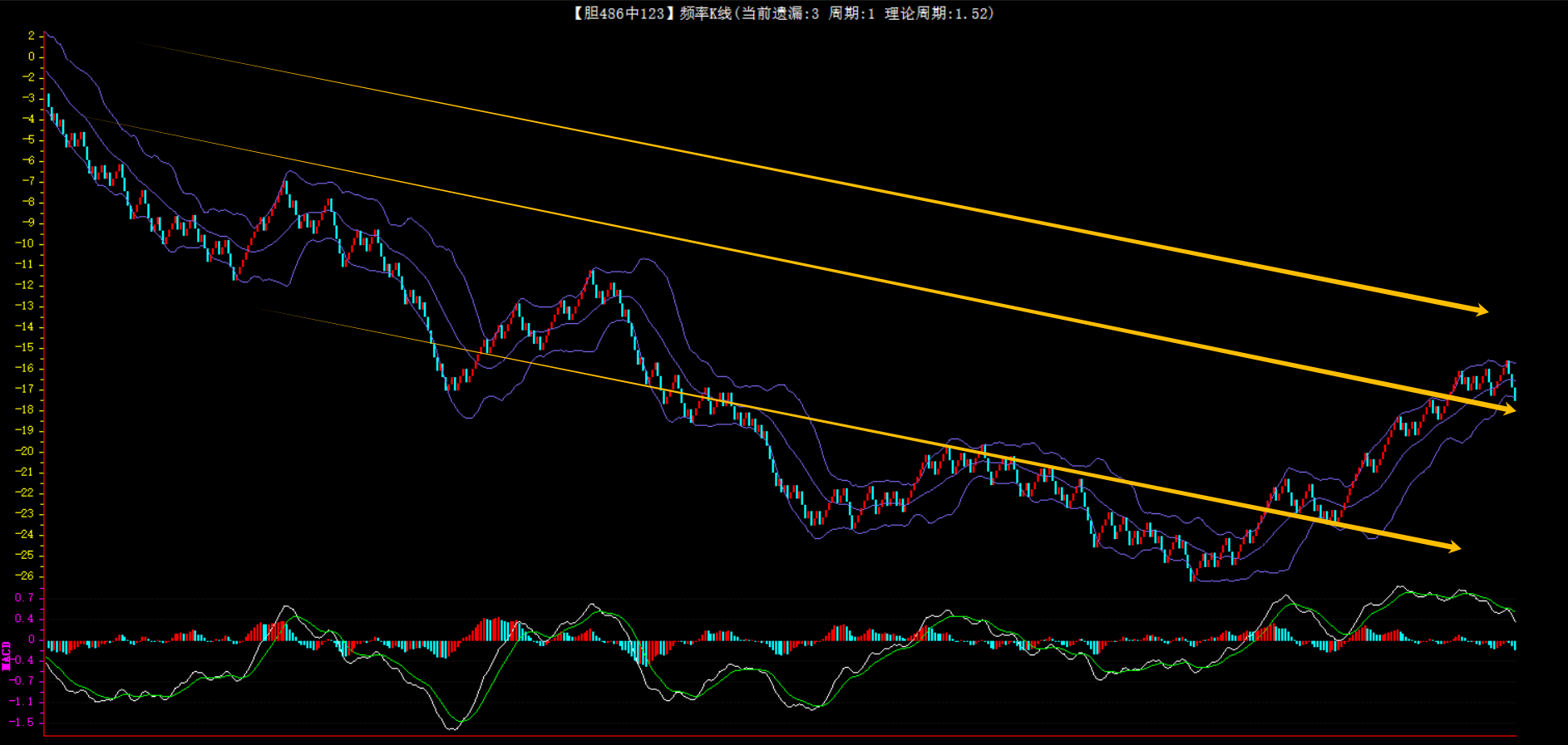 整体趋势下行,上边沿线趋势向下,下边沿趋势也是向下,节点震荡,当前遗漏1期,本期防守。