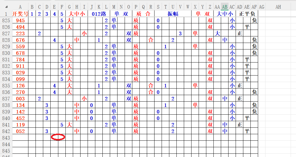 回顾034期:开奖号:052,均值:2,和值:07,跨度:5跨,大小比例 1:2,单双比例:1:2 012路:1:0:2