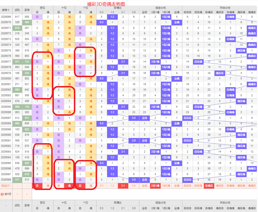 上期奇偶比是3:0,全奇的号码组合方式,从近五期的奇偶数出现情况看,奇数出现6次,偶数出现9次,奇数号码出现较少,本期侧重两奇的号码组合,侧重奇偶奇或偶偶奇的号码组合方式,根据奇偶形态做五码定位13579/02468/13579或02468/02468/13579